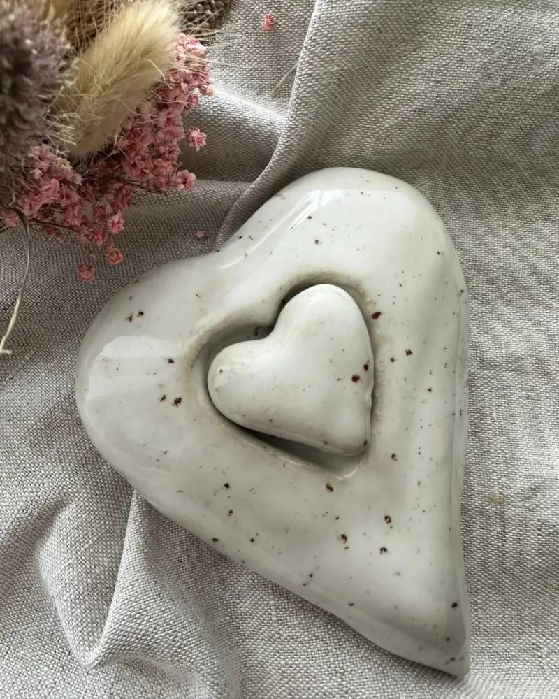 Knuffelhartjes waarbij de assen verwerkt zijn in de klei